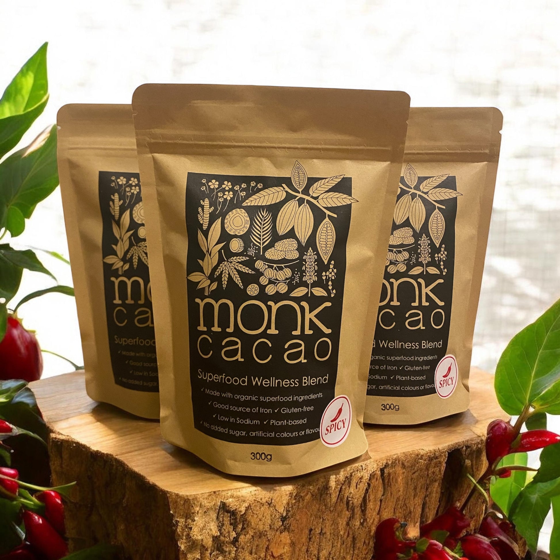 It offers a nourishing nutritional profile and is an excellent source of dietary fibre, a natural source of iron, gluten-free, low in sodium, and contains no added sugar, artificial colours, or flavours. Like all Monk Cacao blends, it is 100% plant-based.